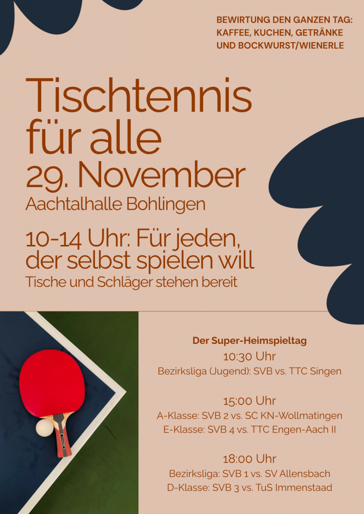 Den 29. November dick und fett in den Kalender eintragen! Alle Mannschaften haben ein Heimspiel und wir wollen ein großes Tischtennis-Fest daraus machen. Mehr News folgen noch.
